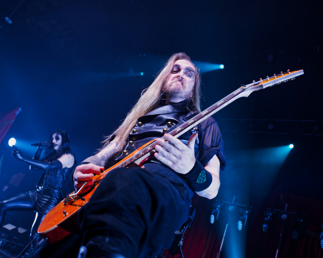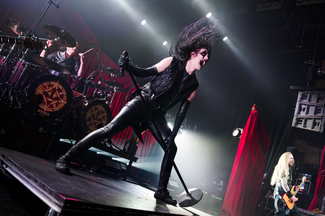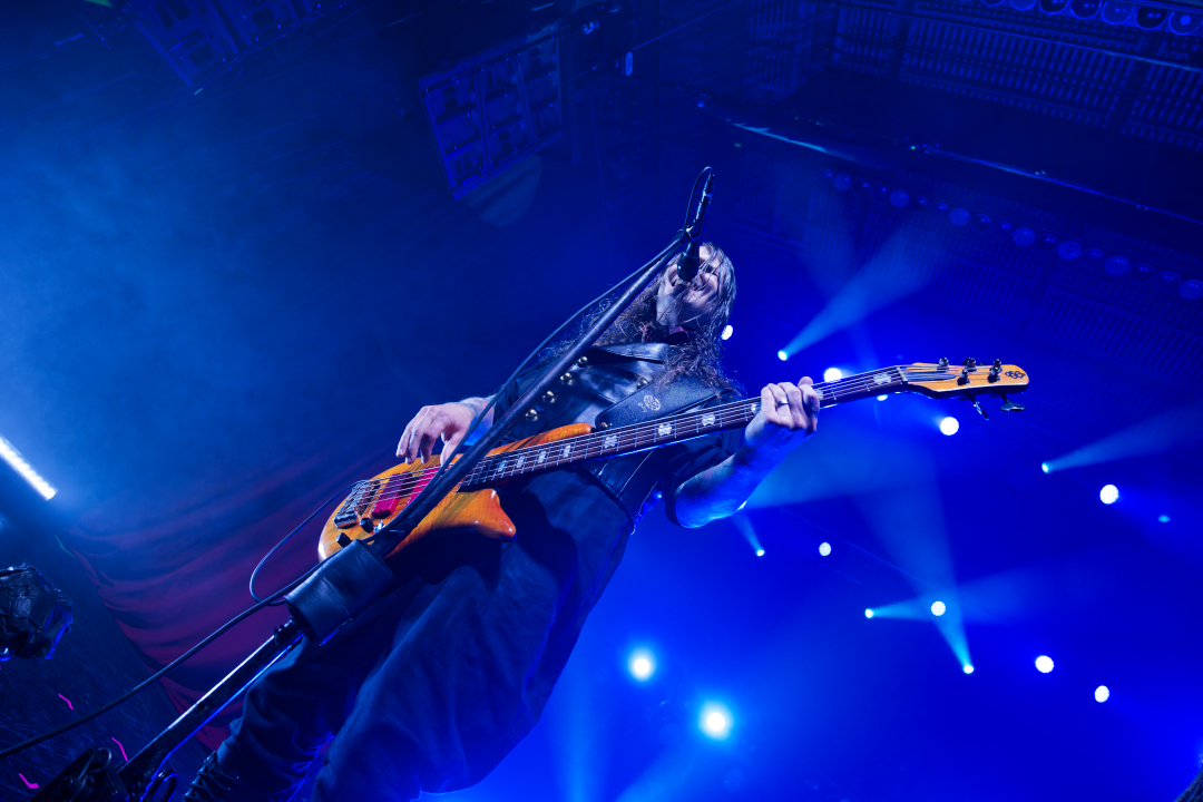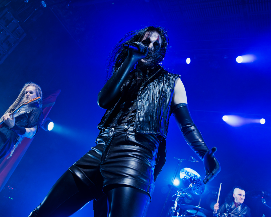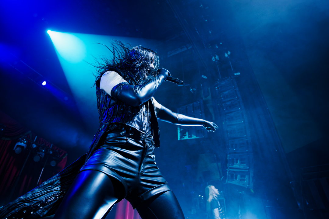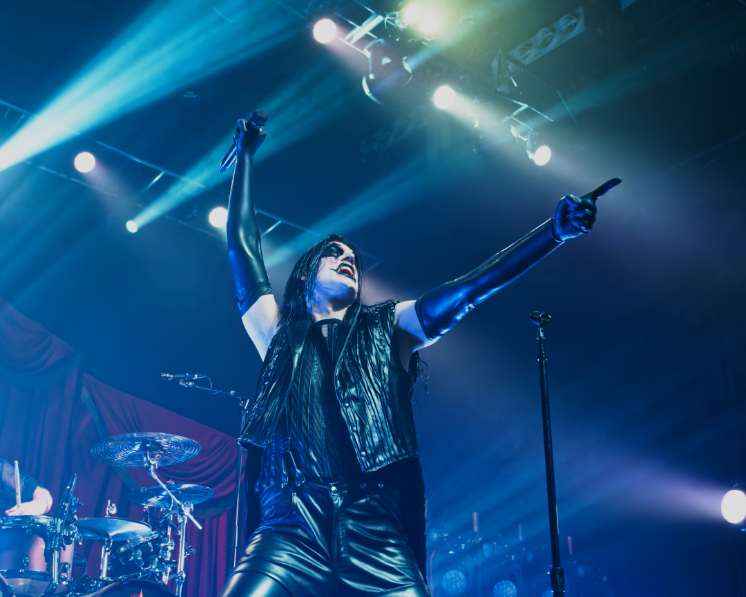 They didn’t walk onstage. They arrived, the stage drifted them center as if they themselves were floating. Shadows moved through the fog. Angles sharp enough to cut glass. And then Johannes stepped into the light. BOOM. Ringmaster energy radiating from every pore. Hair perfect, makeup immaculate, presence so commanding it could herd a thousand screaming metalheads.