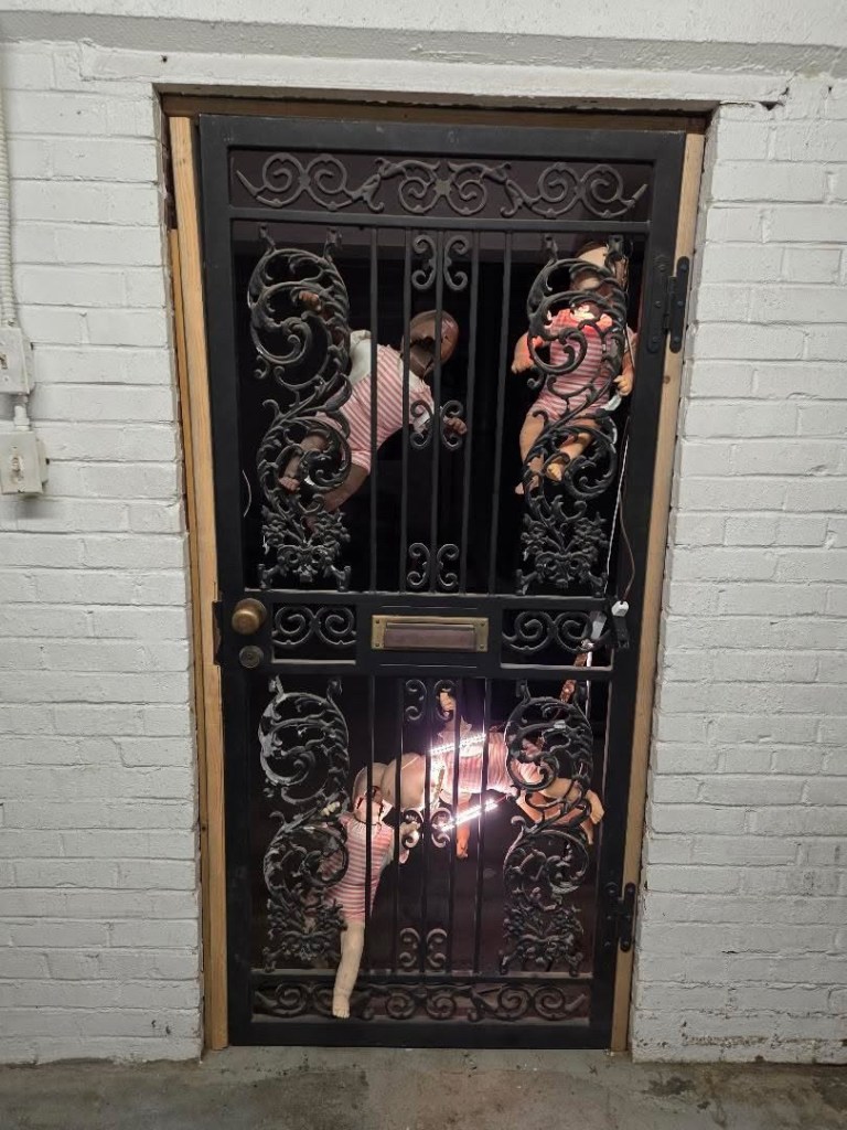 Inside the door was a dirty stairwell with walls covered in decayed peeling paint. I walked down the steps and at the bottom was a concrete lobby with a table to check in at, free ear plugs, a broken metal detector and a barred doorway crawling with faceless baby dolls. I was in love already. Past the lobby was a bar area with a huge mural of Tank Girl. I was thrilled to see a Burial Beer sticker on a keg behind the bar. Burial from North Carolina is my favorite brewery, they have the best stouts of all time and their IPAs will eat your face off. Their bottles and cans are adorned with beautiful and sometimes horrifying illustrations by David Paul Seymour. They do not ship to Arkansas, so this was a very special treat for me.