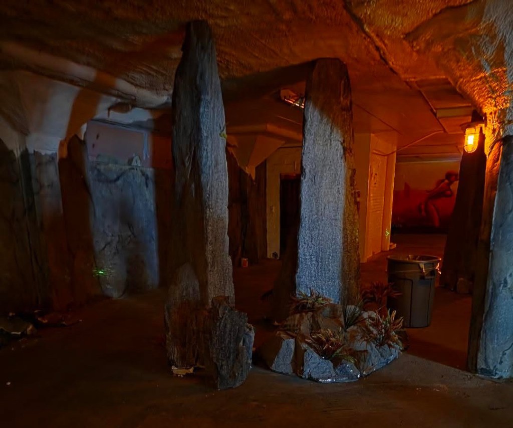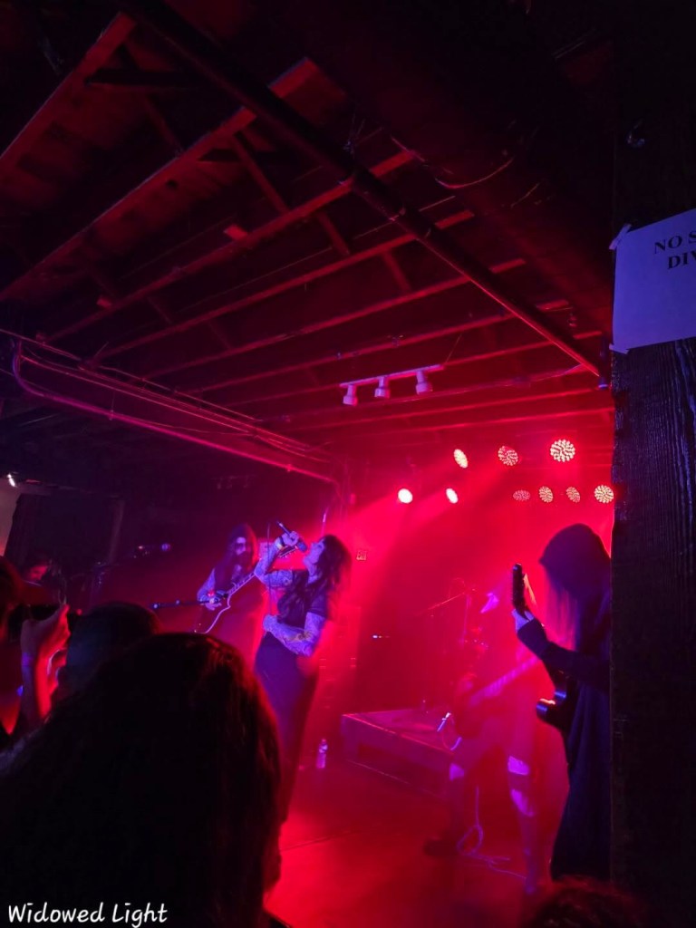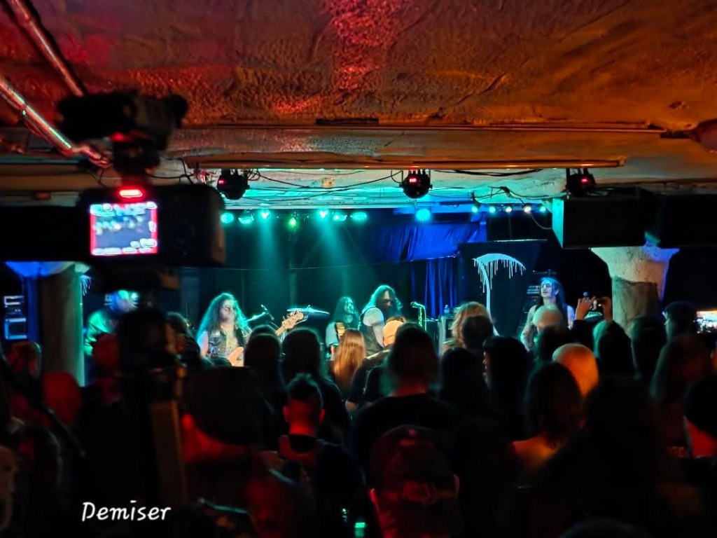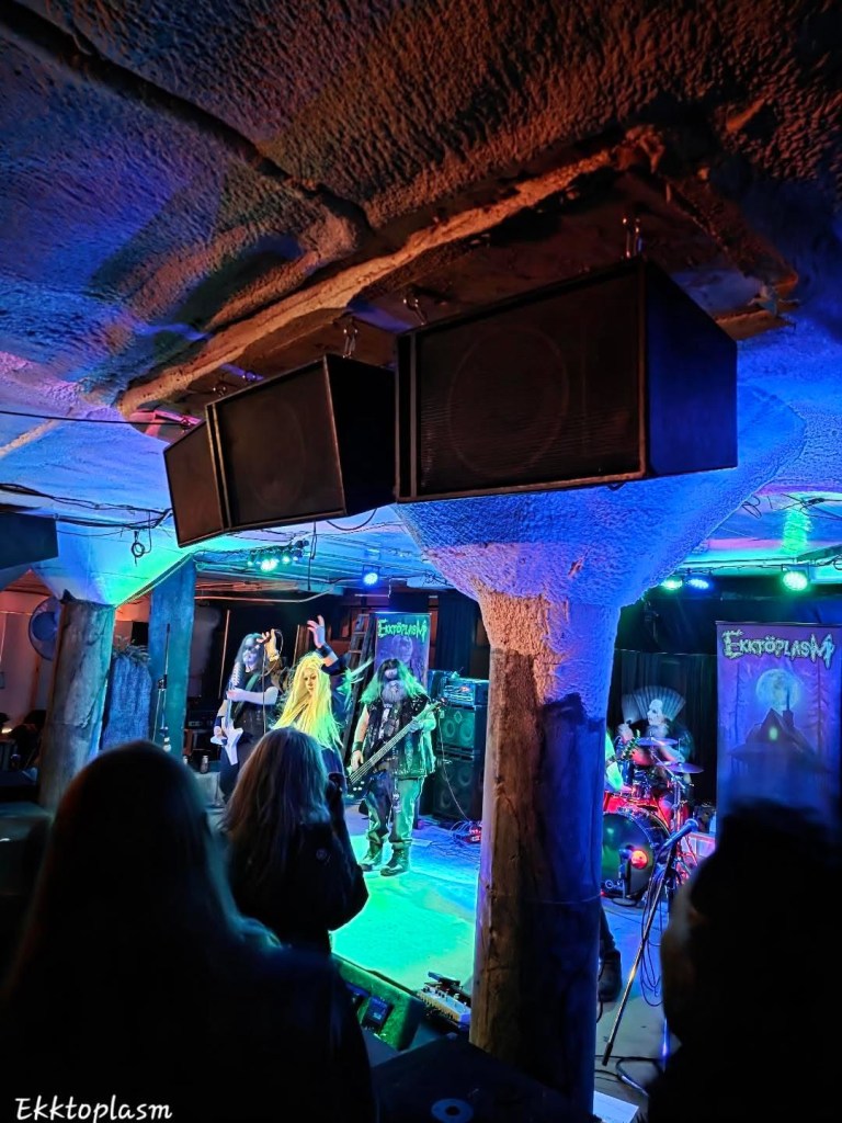 The gal running the bar and check in area was cool as hell and also a fellow solo woman mega traveler. Everyone running the place was a delight. As I drank and talked with people I watched all manner of black clad well dressed heshers and goths jingle and clomp their way into a glowing and flickering room around the corner. The enormous glowing room was where the stage was, which was interspersed with pillars made to look like we were in a cave. Perfect atmosphere for what was to come.